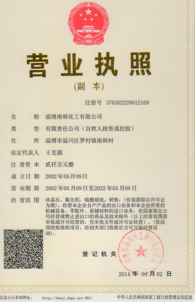 淄博南韓化工有限公司位于淄博市淄川區(qū)羅村鎮(zhèn)南韓村,注冊(cè)資本為2000萬(wàn)元,始建于1995年,原名為淄川區(qū)南韓社會(huì)福利化工廠(chǎng),2002年改制成淄博南韓化工有限公司,占地面積為23000平方米,現(xiàn)有職工300余人,各類(lèi)工程技術(shù)管理人員80余人。目前主要從事氟化鋁、擬薄水鋁石的生產(chǎn)和銷(xiāo)售。 公司工藝完善,技術(shù)力量雄厚,氟化鹽和擬薄水鋁石系列產(chǎn)品各項(xiàng)指標(biāo)均達(dá)到標(biāo)準(zhǔn)。國(guó)內(nèi)用戶(hù)遍布20多個(gè)省市和地區(qū),并出口美國(guó)、韓國(guó)、日本、東南亞等國(guó)。 公司以科學(xué)的管理,致力于構(gòu)建節(jié)能、安全、環(huán)保企業(yè)文化,以穩(wěn)定的質(zhì)量、完善的服務(wù)、合理的價(jià)格贏(yíng)得客戶(hù)的信賴(lài),董事長(zhǎng)王克強(qiáng)先生愿與各界同仁共創(chuàng)美好的未來(lái)!