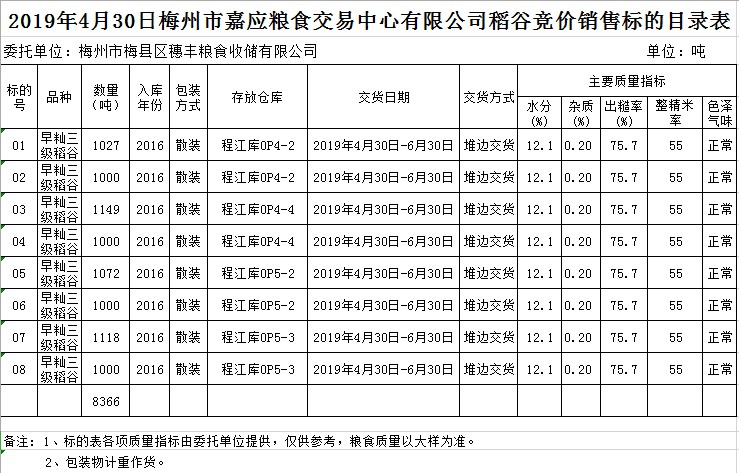交易時間和地點:2019年4月30日(星期二)上午10時。廣東省梅州市彬芳大道南161號梅州市糧食交易中心3樓。