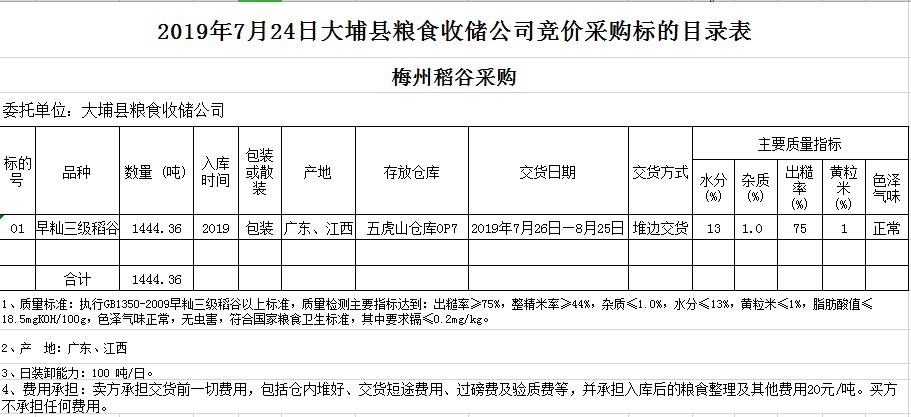 交易時間和地點:2019年7月24日(星期三)上午10時。廣東省梅州市彬芳大道南161號梅州市糧食交易中心3樓。