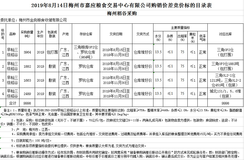 受客戶委托,梅州市嘉應(yīng)糧食交易中心有限公司定于2019年8月14日(星期三)舉辦稻谷購銷價(jià)差聯(lián)動(dòng)標(biāo)的交易會,梅州市金良糧食收儲有限公司擬銷售和采購早秈稻9998噸。