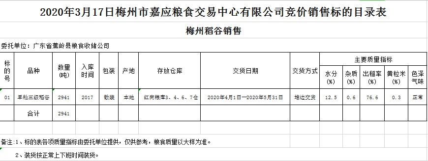 受客戶(hù)委托,梅州市嘉應(yīng)糧食交易中心有限公司定于2020年3月17日(星期二)舉辦糧食競(jìng)價(jià)交易會(huì),廣東省蕉嶺縣糧食收儲(chǔ)公司擬銷(xiāo)售2017年早秈稻2941噸。