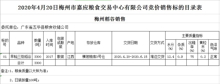 受客戶委托,梅州市嘉應(yīng)糧食交易中心有限公司定于2020年4月20日(星期一)舉辦糧食競價(jià)交易會,廣東省五華縣糧食收儲公司擬銷售2017年早秈稻3300噸。