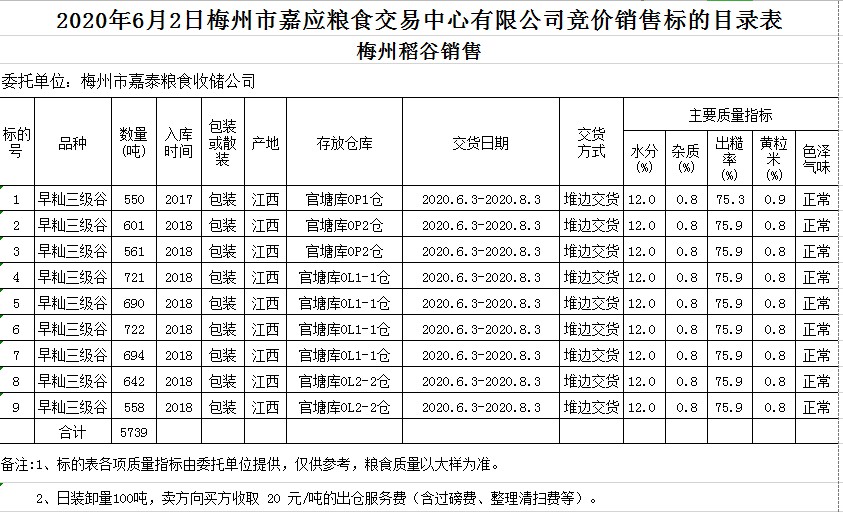 受客戶委托,梅州市嘉應(yīng)糧食交易中心有限公司定于2020年6月2日(星期二)舉辦糧食競(jìng)價(jià)交易會(huì),梅州市嘉泰糧食收儲(chǔ)公司擬銷(xiāo)售2017年、2018年早秈稻5739噸。
