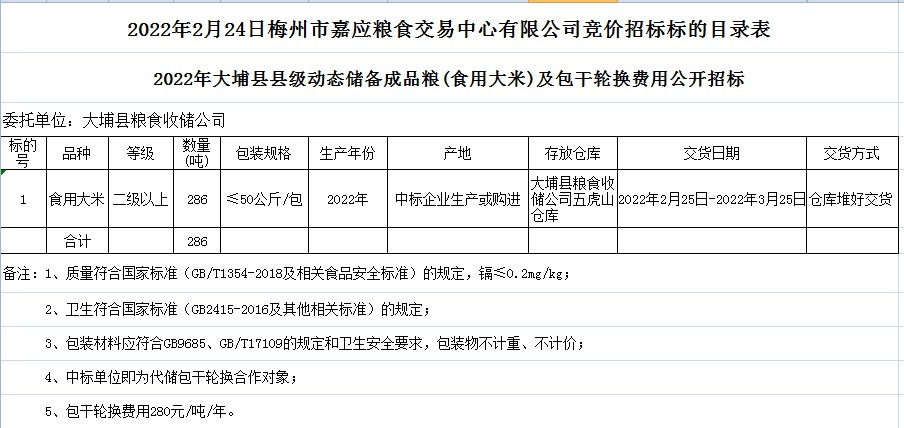 2022年大埔縣縣級動態(tài)儲備成品糧(食用大米)及包干輪換費(fèi)用公開招標(biāo)公告