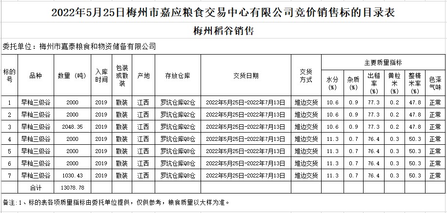 受客戶委托,梅州市嘉應(yīng)糧食交易中心有限公司定于2022年5月25日(星期三)舉辦糧食競價交易會。梅州市嘉泰糧食和物資儲備有限公司擬銷售2019年早秈稻13078.78噸。