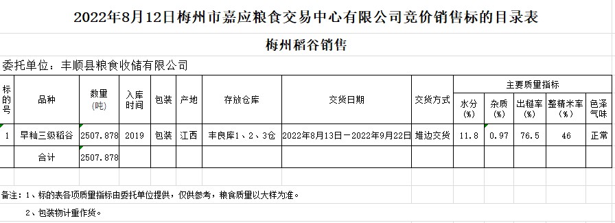 受客戶委托,梅州市嘉應(yīng)糧食交易中心有限公司定于2022年8月12日(星期五)舉辦糧食競價交易會。豐順縣糧食收儲有限公司擬銷售2019年早秈稻2507.878噸。