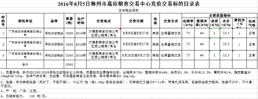 受客戶委托,梅州市嘉應(yīng)糧食交易中心有限公司定于2016年8月5日舉辦糧食競(jìng)價(jià)交易會(huì),廣東省五華縣糧食收儲(chǔ)公司擬采購2016年產(chǎn)早秈三級(jí)稻谷9360噸。