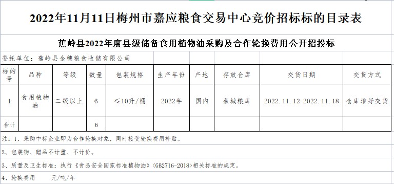 蕉嶺縣2022年度縣級(jí)儲(chǔ)備食用植物油采購(gòu)及合作輪換費(fèi)用公開(kāi)招投標(biāo)公告