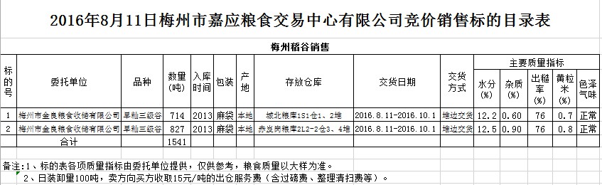 受客戶委托,梅州市嘉應(yīng)糧食交易中心有限公司定于2016年8月11日舉辦糧食競(jìng)價(jià)交易會(huì),梅州市金良糧食收儲(chǔ)有限公司擬銷售2013年產(chǎn)早秈三級(jí)稻谷1541噸。