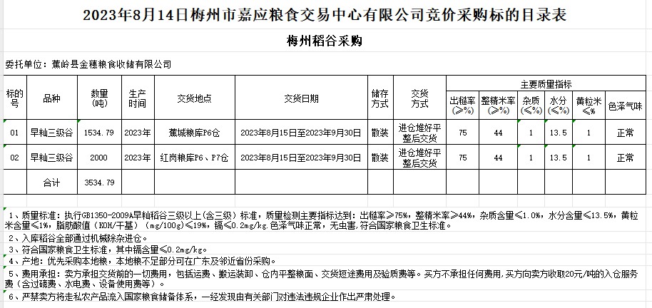 受客戶委托,梅州市嘉應(yīng)糧食交易中心有限公司定于2023年8月14日(星期一)舉辦糧食競價交易會。蕉嶺縣金穗糧食收儲有限公司擬采購2023年早秈稻3534.79噸。