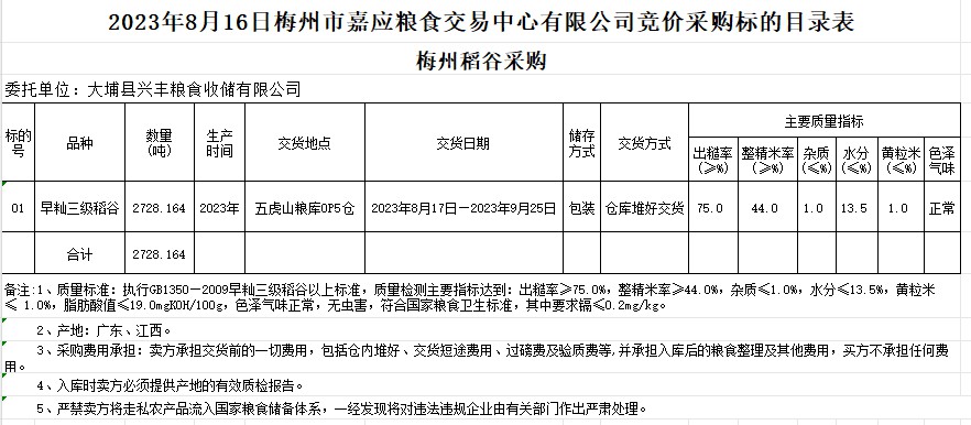 受客戶委托,梅州市嘉應(yīng)糧食交易中心有限公司定于2023年8月16日(星期三)舉辦糧食競(jìng)價(jià)交易會(huì)。大埔縣興豐糧食收儲(chǔ)有限公司擬采購(gòu)2023年早秈稻2728.164噸。