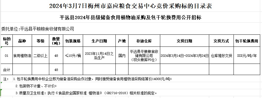 受平遠(yuǎn)縣平糧糧食收儲有限公司委托,梅州市嘉應(yīng)糧食交易中心有限公司定于2024年3月7日(星期四)上午10時舉辦平遠(yuǎn)縣2024年縣級儲備食用植物油采購及包干輪換費用公開招標(biāo)。