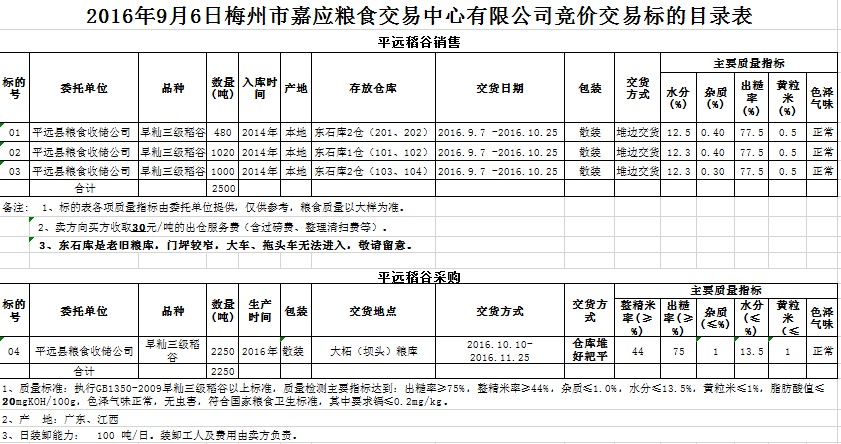 受客戶委托,平遠縣糧食收儲公司擬銷售2014年早秈三級稻谷2500噸、采購2016年產(chǎn)早秈三級稻谷2250噸。