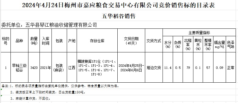 受客戶委托,梅州市嘉應(yīng)糧食交易中心有限公司定于2024年4月24日(星期三)舉辦糧食競價(jià)交易會(huì)。五華縣琴江糧油收儲(chǔ)管理有限公司擬銷售2021年產(chǎn)早秈稻3420噸。