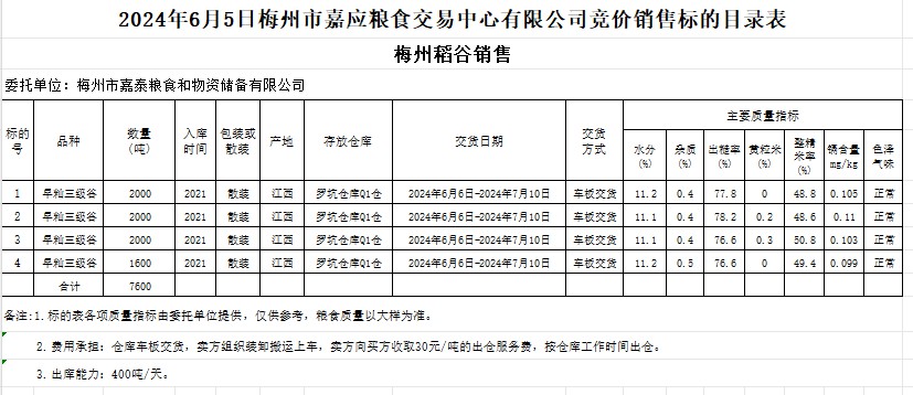 受客戶委托,梅州市嘉應(yīng)糧食交易中心有限公司定于2024年6月5日(星期三)舉辦糧食競價交易會。梅州市嘉泰糧食和物資儲備有限公司擬銷售2021年產(chǎn)早秈稻7600噸。