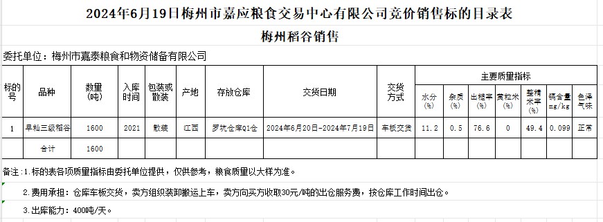 受客戶委托,梅州市嘉應(yīng)糧食交易中心有限公司定于2024年6月19日(星期三)舉辦糧食競價(jià)交易會。梅州市嘉泰糧食和物資儲備有限公司擬銷售2021年產(chǎn)早秈稻1600噸。