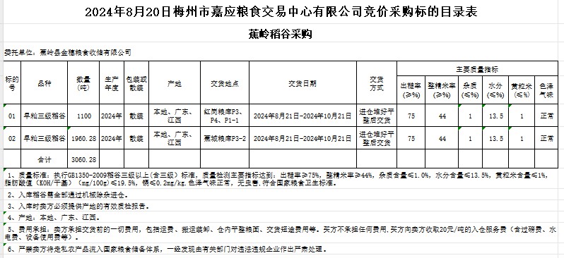 受客戶委托,梅州市嘉應(yīng)糧食交易中心有限公司定于2024年8月20日(星期二)舉辦糧食競價(jià)交易會(huì)。蕉嶺縣金穗糧食收儲(chǔ)有限公司擬采購2024年產(chǎn)早秈稻3060.28噸。