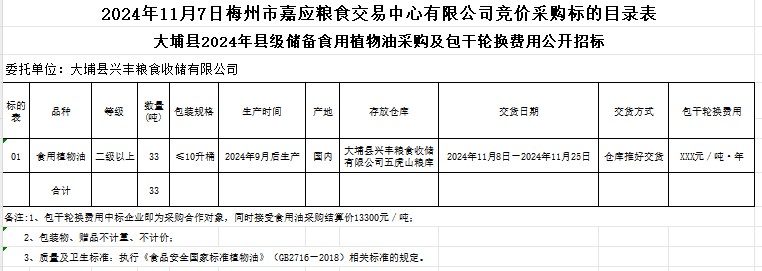 受大埔縣興豐糧食收儲有限公司委托,梅州市嘉應糧食交易中心有限公司定于2024年11月7日(星期四)上午10:30在廣東省梅州市彬芳大道南161號梅州市糧食交易中心3樓,舉辦大埔縣2024年縣級儲備食用植物油采購及包干輪換費用公開招標。