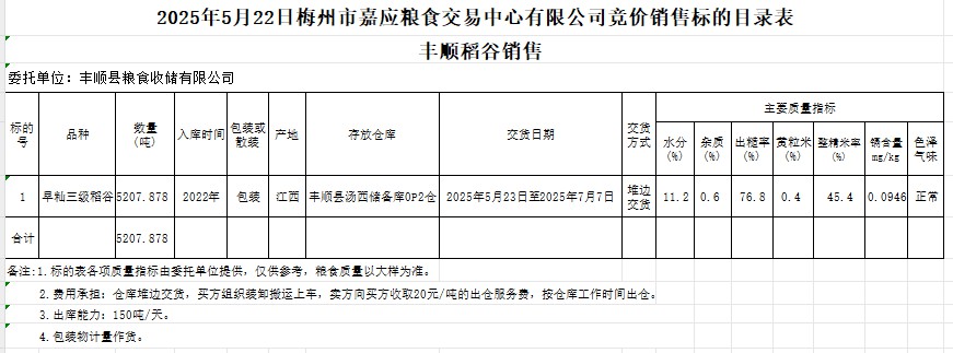 受客戶委托,梅州市嘉應糧食交易中心有限公司定于2025年5月22日(星期四)舉辦糧食競價交易會。豐順縣糧食收儲有限公司擬銷售2022年產(chǎn)早秈稻谷5207.878噸。
