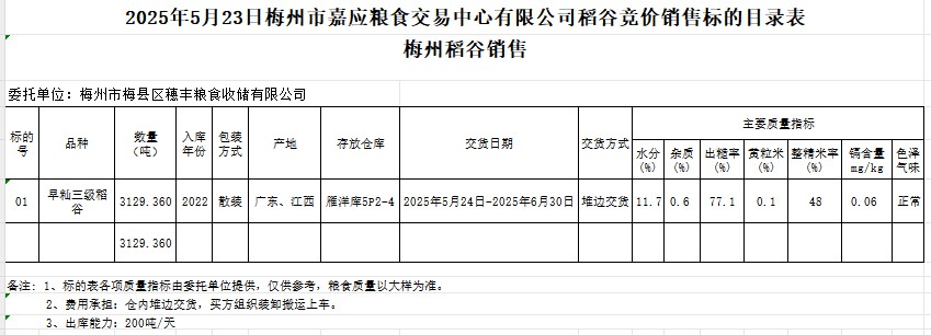 受客戶委托,梅州市嘉應(yīng)糧食交易中心有限公司定于2025年5月23日(星期五)舉辦糧食競(jìng)價(jià)交易會(huì)。梅州市梅縣區(qū)穗豐糧食收儲(chǔ)有限公司擬銷售2022年產(chǎn)早秈稻谷3129.360噸。