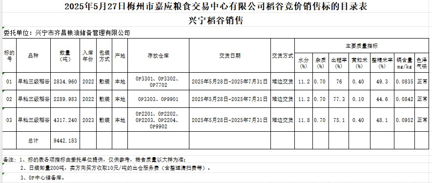 受客戶(hù)委托,梅州市嘉應(yīng)糧食交易中心有限公司定于2025年5月27日(星期二)舉辦糧食競(jìng)價(jià)交易會(huì)。興寧市齊昌糧油儲(chǔ)備管理有限公司擬銷(xiāo)售2022年、2023年產(chǎn)早秈稻谷9442.183噸。