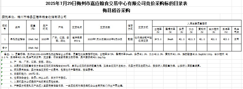 受客戶委托,梅州市嘉應(yīng)糧食交易中心有限公司定于2025年7月29日(星期二)舉辦糧食競價(jià)交易會。梅州市梅縣區(qū)穗豐糧食收儲有限公司擬采購2025年產(chǎn)早秈稻谷2949.542噸。