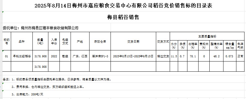 受客戶委托,梅州市嘉應(yīng)糧食交易中心有限公司定于2025年8月14日(星期四)舉辦糧食競(jìng)價(jià)交易會(huì)。梅州市梅縣區(qū)穗豐糧食收儲(chǔ)有限公司擬銷售2022年產(chǎn)早秈稻谷3178.908噸。
