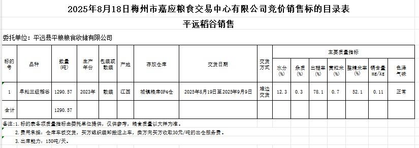 受客戶委托,梅州市嘉應(yīng)糧食交易中心有限公司定于2025年8月18日(星期一)舉辦糧食競價交易會。平遠(yuǎn)縣平糧糧食收儲有限公司擬銷售2023年產(chǎn)早秈稻谷1290.57噸。