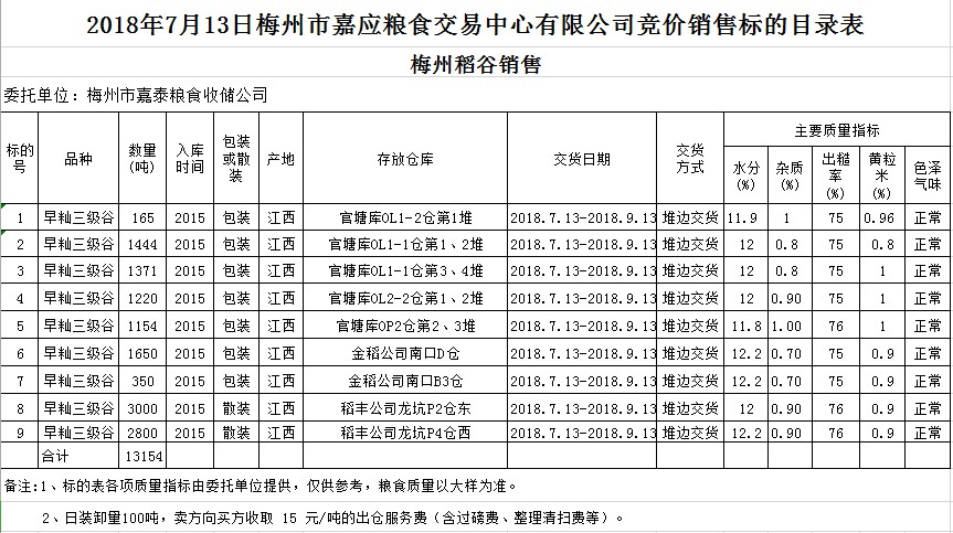 受客戶委托,梅州市嘉應(yīng)糧食交易中心有限公司定于2018年7月13日(星期五)舉辦糧食競(jìng)價(jià)交易會(huì),梅州市嘉泰糧食收儲(chǔ)公司擬銷售早秈稻13154噸。